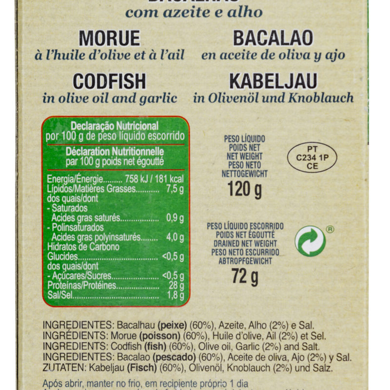 | Ingredients | Codfish (60%), olive oil, garlic (2%), salt |